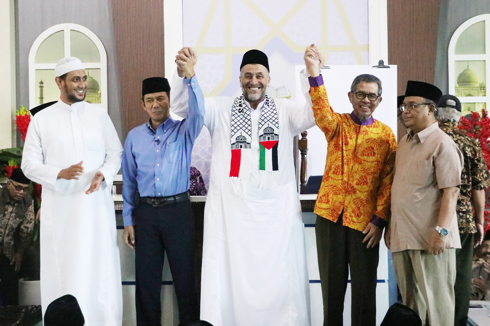 Berbicara di depan ribuan peserta pengajian, Syaikh Muzhaffar menceritakan kekejaman zionis Israel dalam pembantaian dan genosida yang dilakukan kepada warga Palestina dan keluarganya.